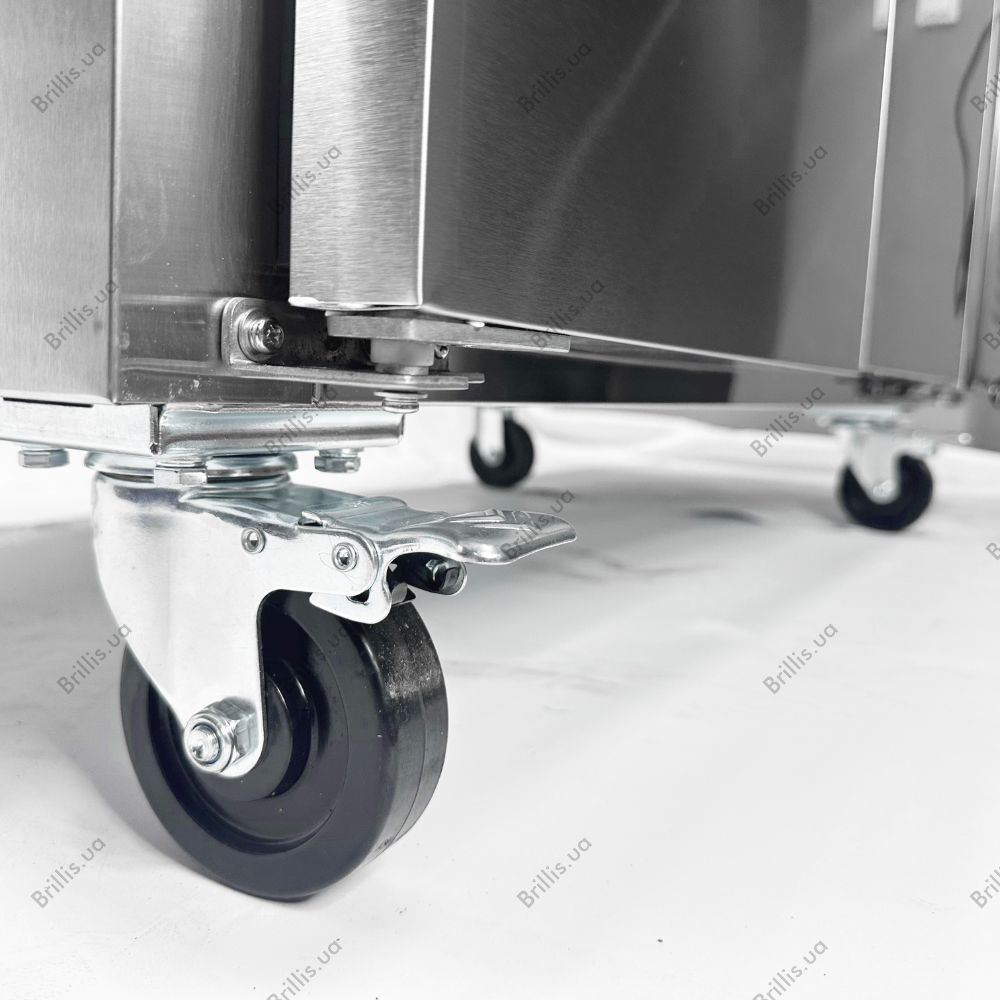 Корпус і внутрішня камера виконані з нержавіючої сталі AISI 201, що гарантує міцність, гігієнічність та захист від корозії. Для зручності пересування стіл оснащений 4 колесами, 2 з яких мають гальма для надійної фіксації.