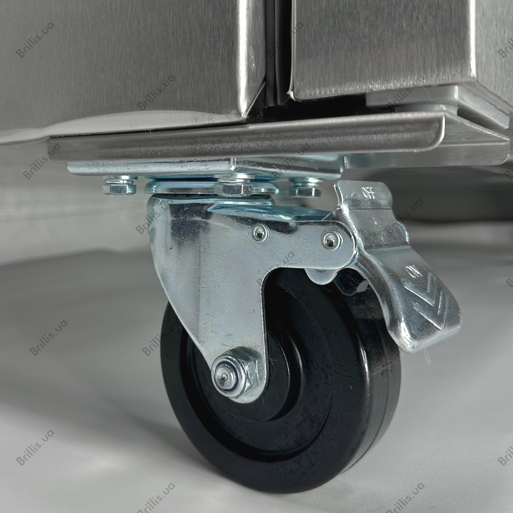 Корпус шкафа изготовлен из высококачественной нержавеющей стали AISI 304 внутри и AISI 430 снаружи, что обеспечивает надежность и устойчивость к износу, а также соответствует высоким гигиеническим стандартам. Модель имеет объем в 1300 литров, что позволяет хранить большое количество продуктов. Имеет четыре колеса, два из которых оснащены тормозами, что облегчает перемещение оборудования.