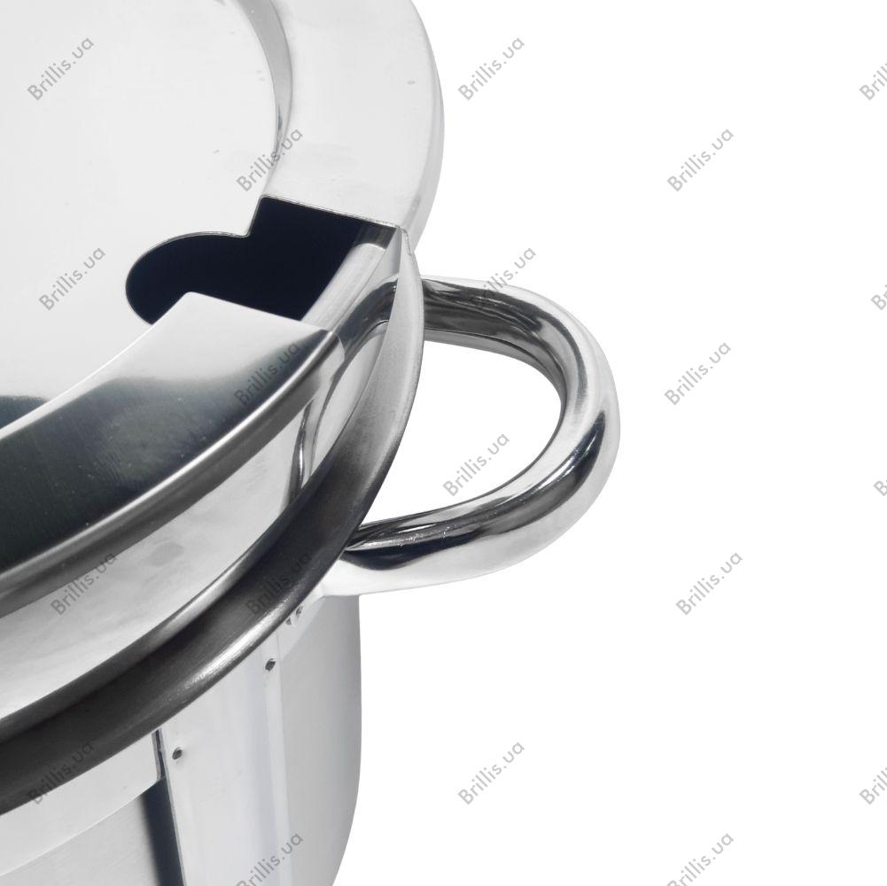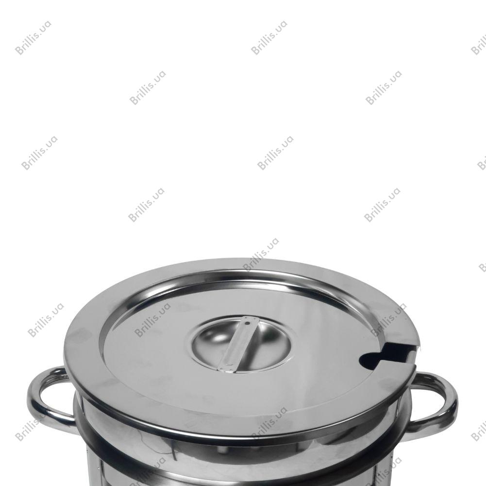 Крышка оснащена удобным отверстием для черпака, позволяющим разливать блюда без необходимости полного открывания, а рама из нержавеющей стали обеспечивает надежную фиксацию всех элементов.