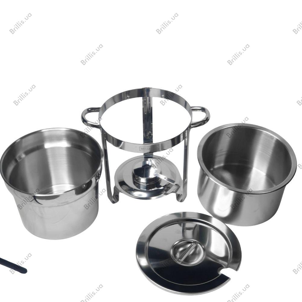 В комплект входит емкость для горючего, благодаря чему супница может работать с горючей пастой или сухим спиртом. Также модель совместима с электронагревателем EW002 в комплект не входит, что расширяет возможности использования.